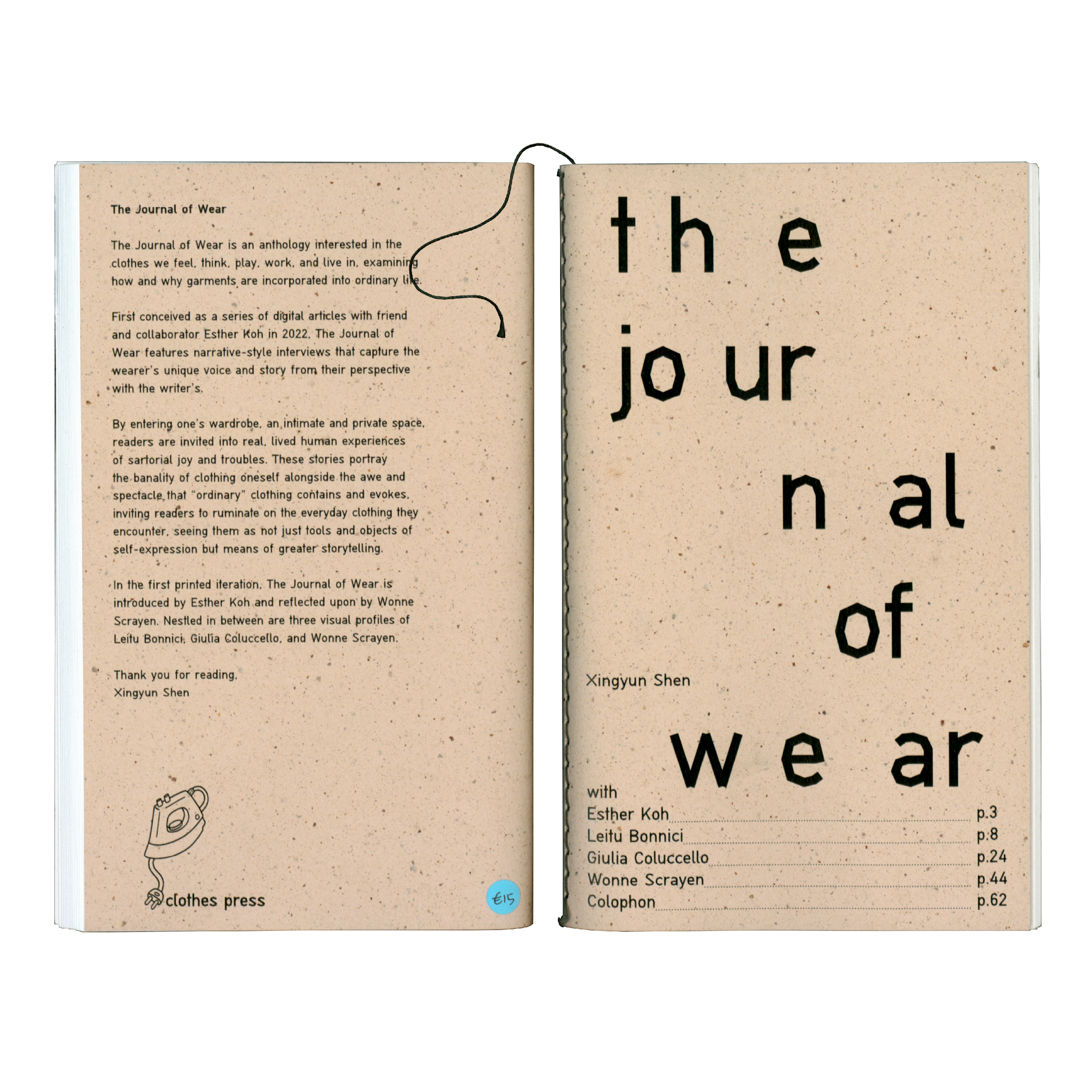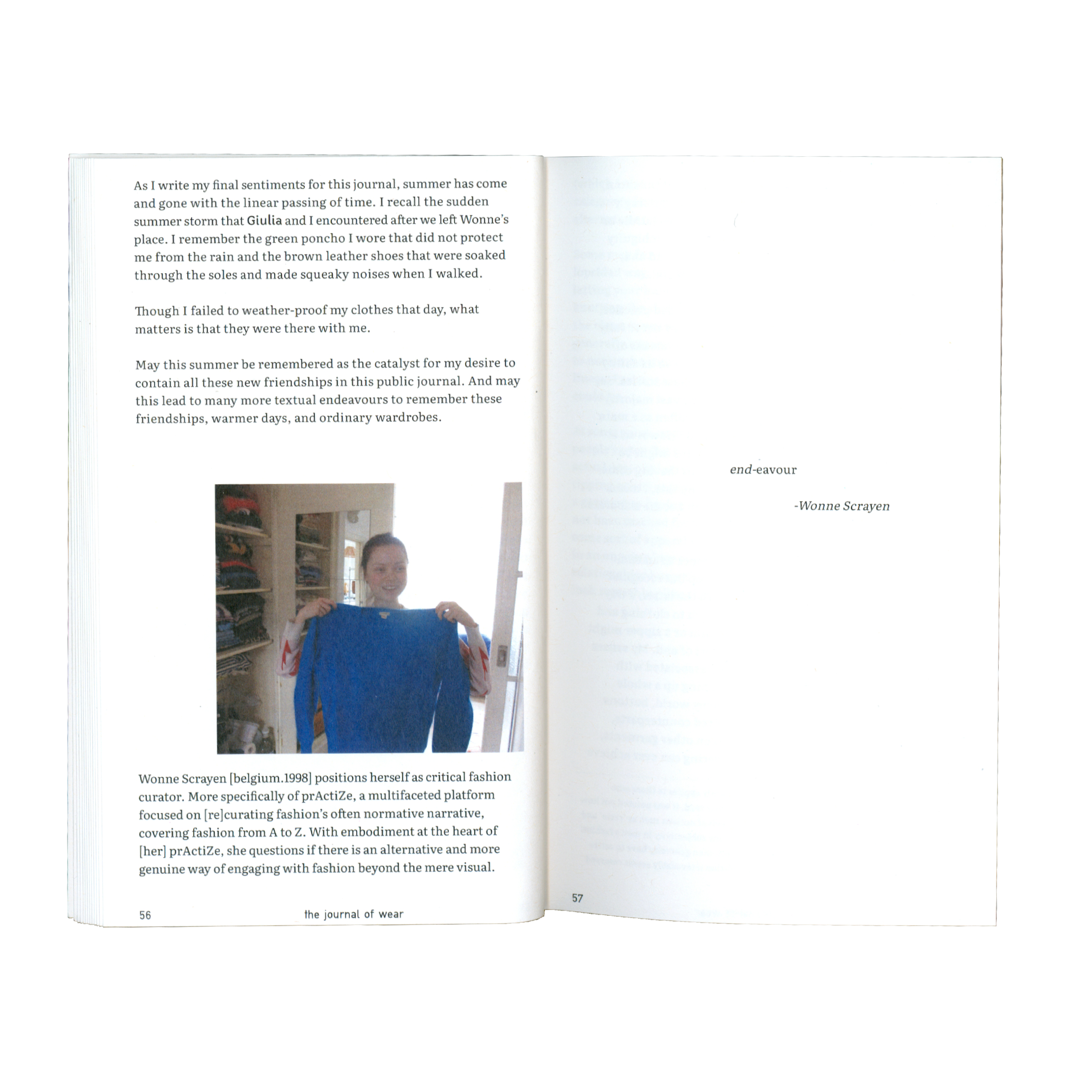 In the first printed iteration, The Journal of Wear is introduced by Esther Koh and reflected upon by Wonne Scrayen. Nestled in between are three visual profiles of Leitu Bonnici, Giulia Coluccello, and Wonne Scrayen.